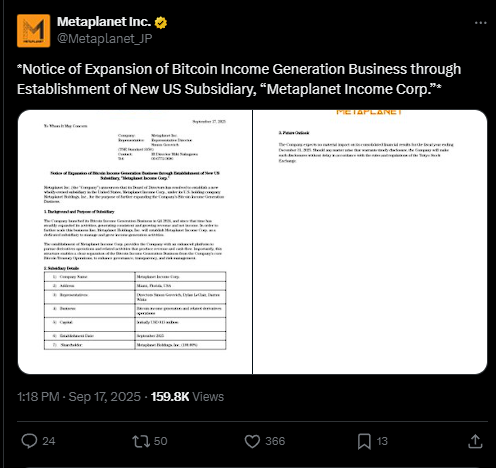 11 Japanese company Metaplanet was earlier known for its work in hospitality and real estate, but today it has become a well-known Bitcoin treasury firm. The company recently shared that it has started two new subsidiaries in the United States and Japan. The purpose of these new units is to increase income from Bitcoin and also to build a stronger presence in crypto media. The US office will focus on Bitcoin trading and revenue generation, while the Japan office will manage media, events, and community projects. This shows Metaplanet’s clear focus on building a Bitcoin-first future. US Subsidiary Launch: Metaplanet Income Corp. Metaplanet has created a new company in Miami, Florida called Metaplanet Income Corp. The subsidiary begins with 15 million dollars in capital and will focus on earning income through Bitcoin and trading Bitcoin-related products. The purpose of this new unit is to keep Metaplanet’s long-term Bitcoin holdings separate from its everyday income activities. By doing this, the company can protect its main Bitcoin reserves while still finding new ways to generate revenue from the crypto market. The subsidiary will be led by Metaplanet CEO Simon Gerovich, together with Dylan LeClair and Darren Winia, who bring experience in Bitcoin and financial markets. Metaplanet said the launch of this company will not make a big difference to its financial results for 2025. However, it shows the company’s growing commitment to building a stronger Bitcoin strategy and expanding its role in the global crypto industry. Japan Subsidiary Launch: Bitcoin Japan Inc. In Japan, Metaplanet has set up a new company called Bitcoin Japan Inc. The subsidiary is based in Tokyo’s Roppongi Hills and will play an important role in the company’s local Bitcoin strategy. Its main focus will be on Bitcoin-related media and community events. Bitcoin Japan Inc. will look after the recently acquired domain Bitcoin.jp. It will also manage Bitcoin Magazine Japan, a popular publication dedicated to digital currency news and education. Another major responsibility of the new company will be organizing the Bitcoin Japan Conference, an event designed to bring together experts, businesses, and enthusiasts to discuss the future of Bitcoin in Japan. Through these projects, Metaplanet wants to increase awareness about Bitcoin and create stronger community engagement. The new subsidiary will be led by directors Simon Gerovich and Yoshihisa Ikurumi, who will guide its efforts to build a stronger presence in Japan’s crypto space. Metaplanet’s Expanding Bitcoin Holdings Metaplanet is quickly growing its Bitcoin treasury at a time when corporate interest in digital assets is rising worldwide. Earlier this year, the company shared its plan to raise about 204.1 billion yen, which is equal to 1.4 billion US dollars. The money will come from an international share offering and will be used to purchase more Bitcoin. At present, Metaplanet holds more than 20,136 BTC in its reserves. This large amount has made the company the sixth biggest Bitcoin holder in the world, according to BitcoinTreasuries.net. Only a few large American firms are ahead of it in the rankings. MicroStrategy is at the top with around 638,985 BTC worth tens of billions of dollars. It is followed by Mara Holdings with 52,477 BTC and XXI with 43,514 BTC. Related: Metaplanet clears path for $3.7B Bitcoin accumulation strategy Conclusion Metaplanet’s new announcements show that it is one of the strongest corporate supporters of Bitcoin outside the United States. The company is growing both internationally and in Japan, which proves its long-term plan to create more income from Bitcoin and to support the wider crypto industry. As more global companies race to collect Bitcoin, Metaplanet is following a smart strategy. By building a large Bitcoin treasury and using [$BTC Technical] insights to guide its operations, the company is creating steady income from new business units and positioning itself as an important leader in the digital asset economy for years to come.
